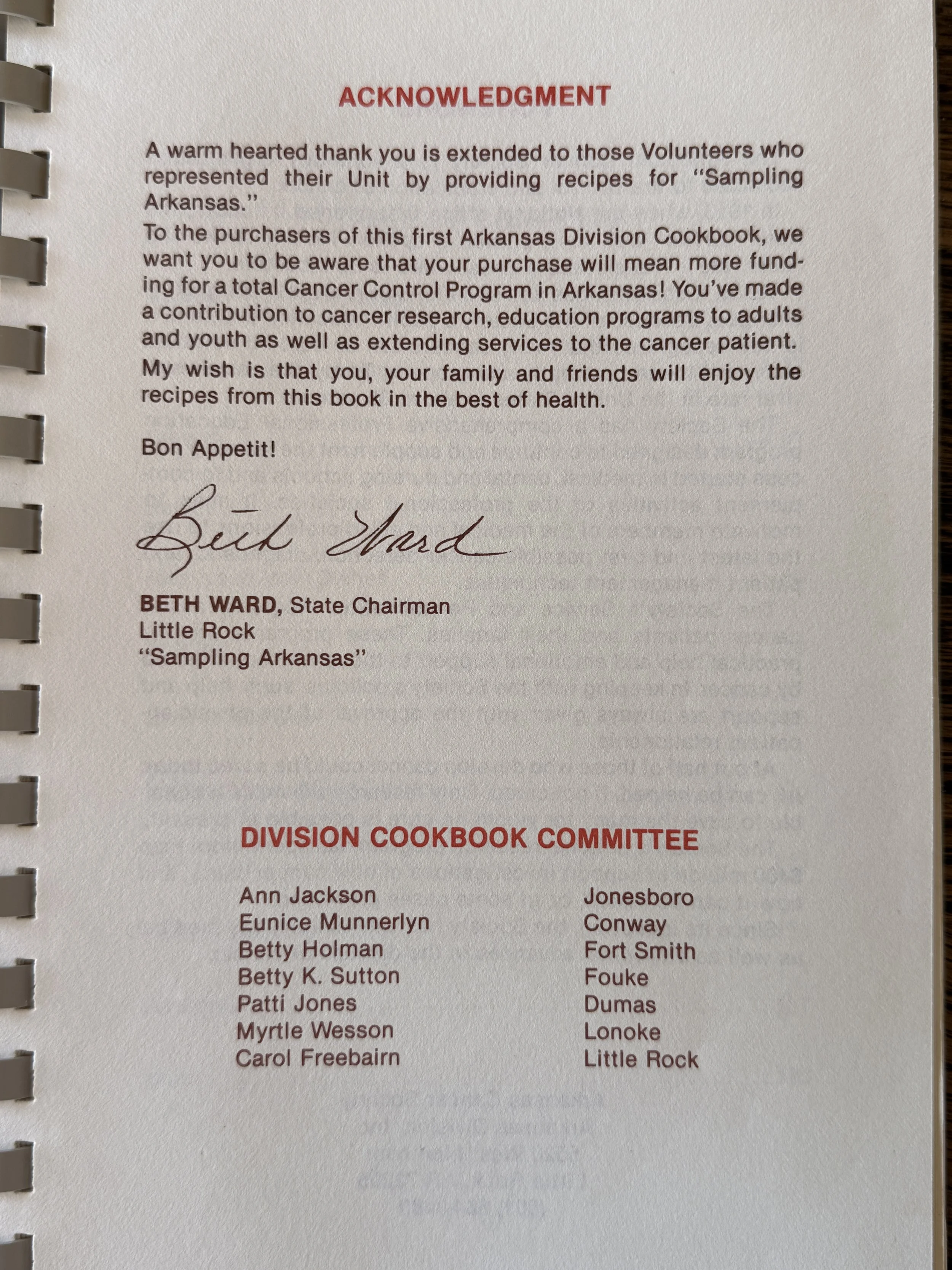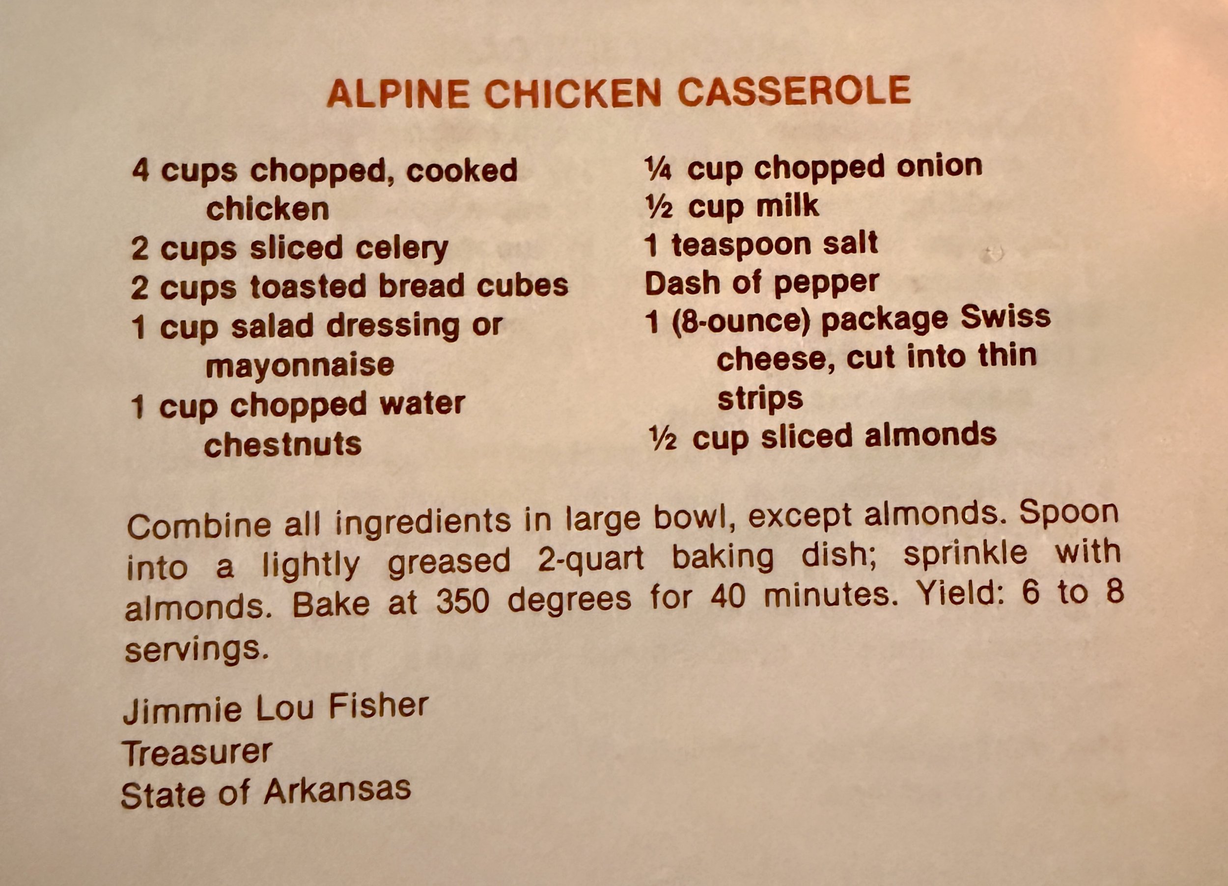 Jimmie Lou Fisher, a trailblazing woman in Arkansas politics, generously shared this recipe as a contribution to Sampling Arkansas, a community cookbook published in 1983 to benefit the American Cancer Society. She was the longest-serving state treasurer in the state’s history, and this book brought together favorite recipes from notable Arkansans and local families alike, using food as a way to support an important cause. By donating her recipe, Fisher helped turn a simple, comforting dish into part of a larger effort to raise funds and awareness, reflecting both her public service and her willingness to give back beyond politics.