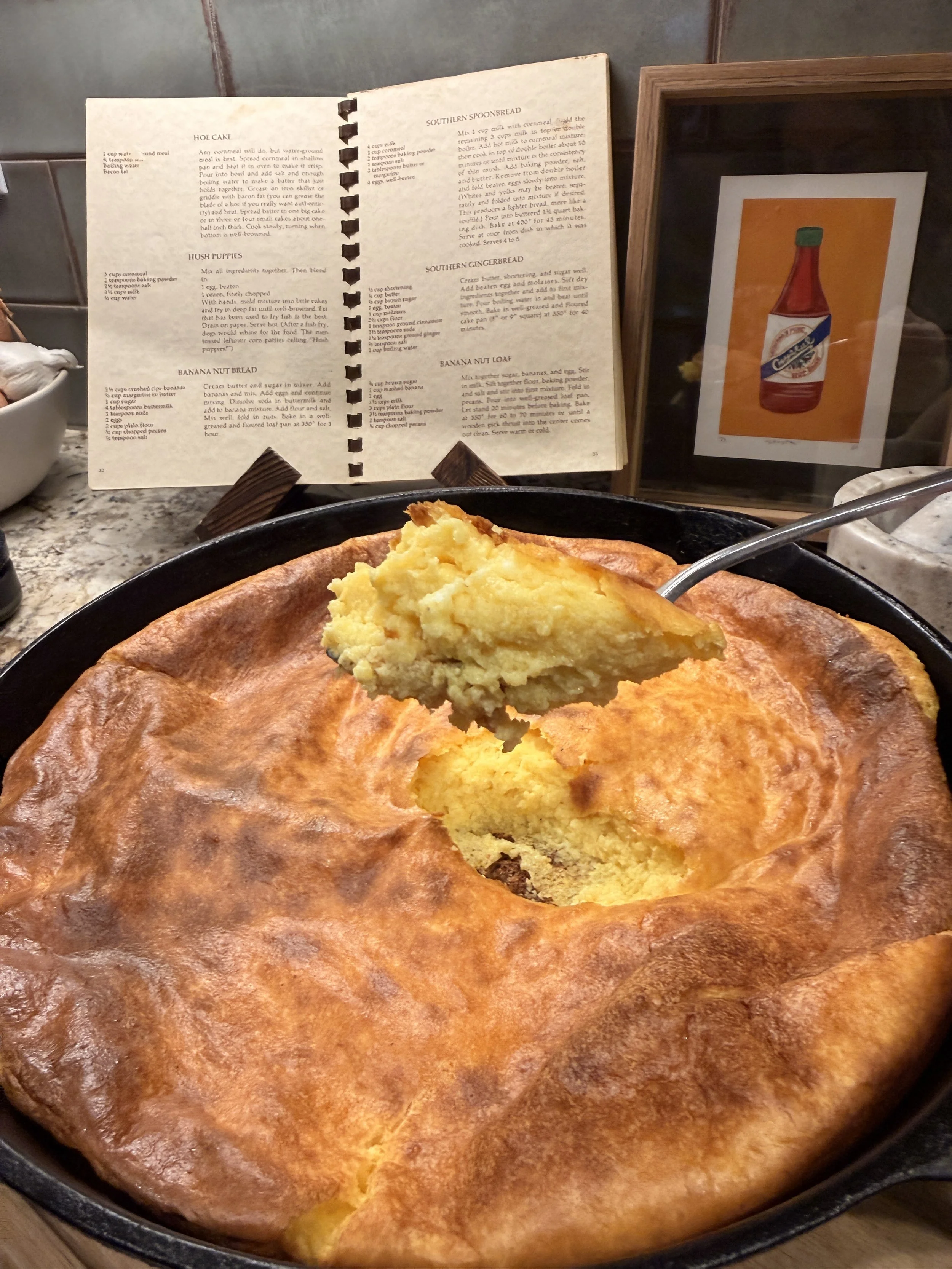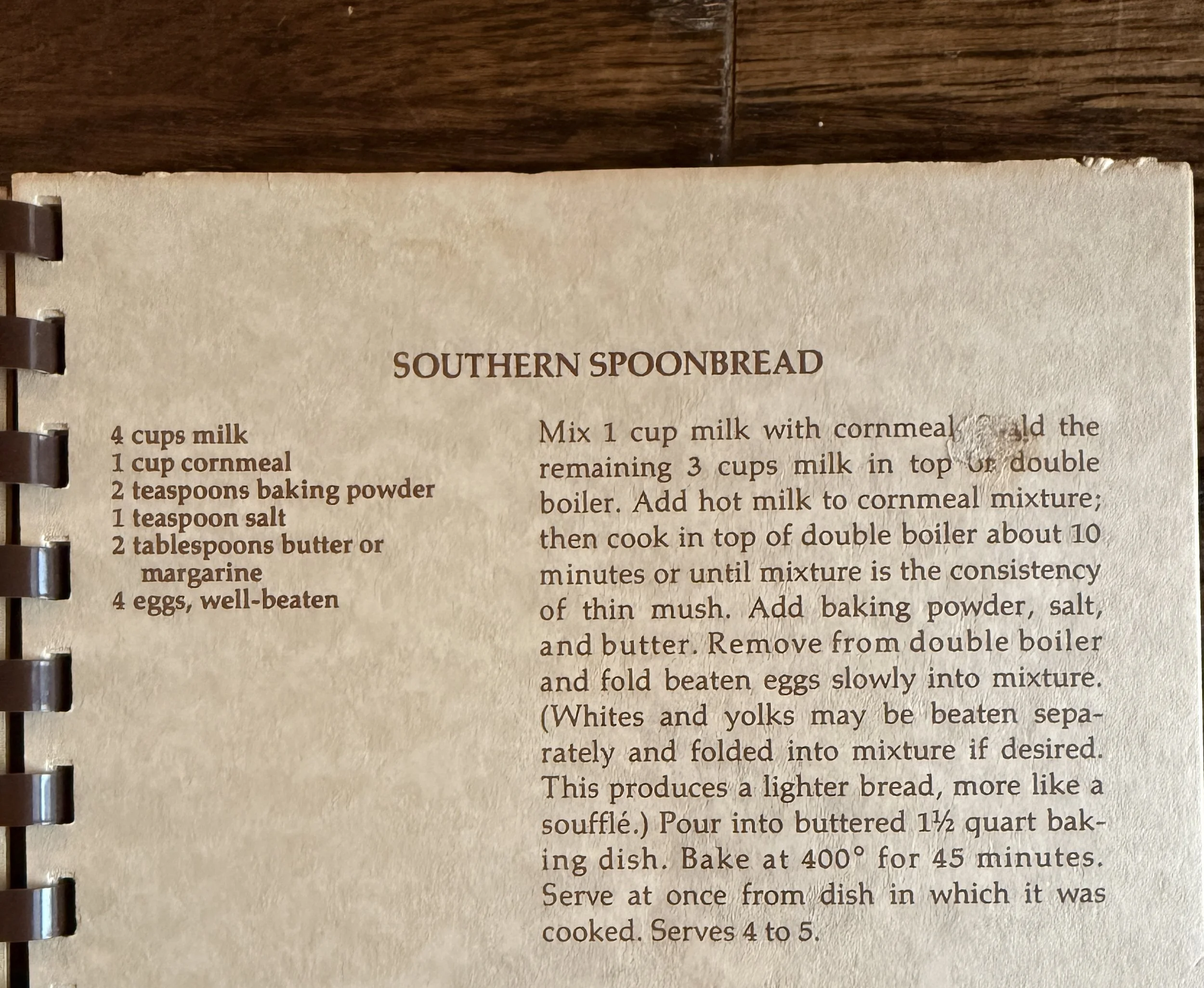 Souther Spoonbread is one of those quietly magical dishes that turns the humblest pantry staples into something truly special. This recipe comes from Over the Whistling Walk by Catherine Munsell Lackmond of Houston, Texas—a cookbook rooted in Southern sensibility and thoughtful, time-honored technique. While the ingredient list is simple, the method is anything but ordinary: the mixture is carefully stirred over a double boiler, then baked until it rises into a light, airy texture that lands somewhere between tender cornbread and a delicate polenta soufflé. Warm from the oven, it’s softly sweet, comforting, and meant to be eaten by the spoonful—proof that a little patience in the kitchen can turn everyday ingredients into something unforgettable.
